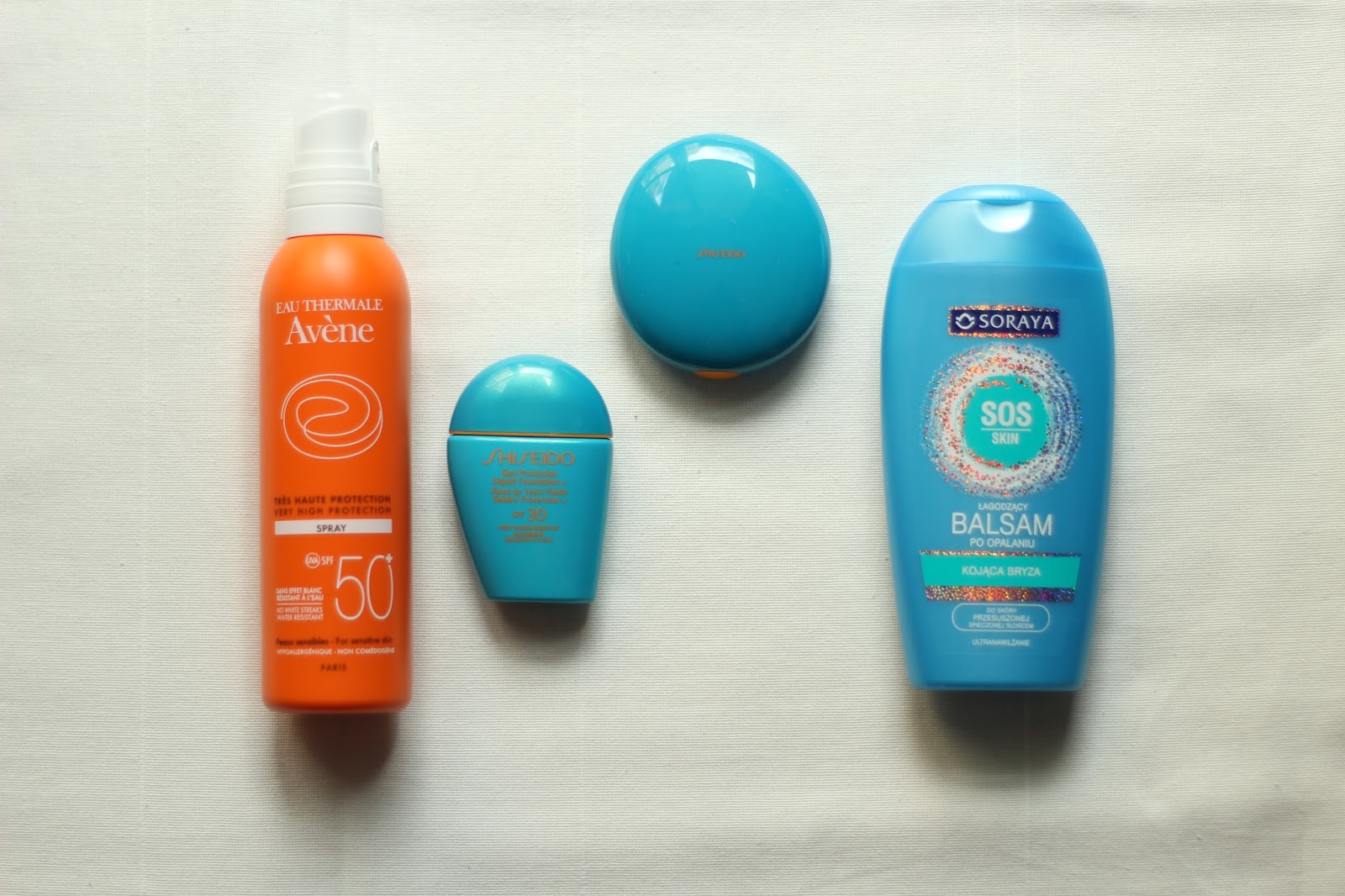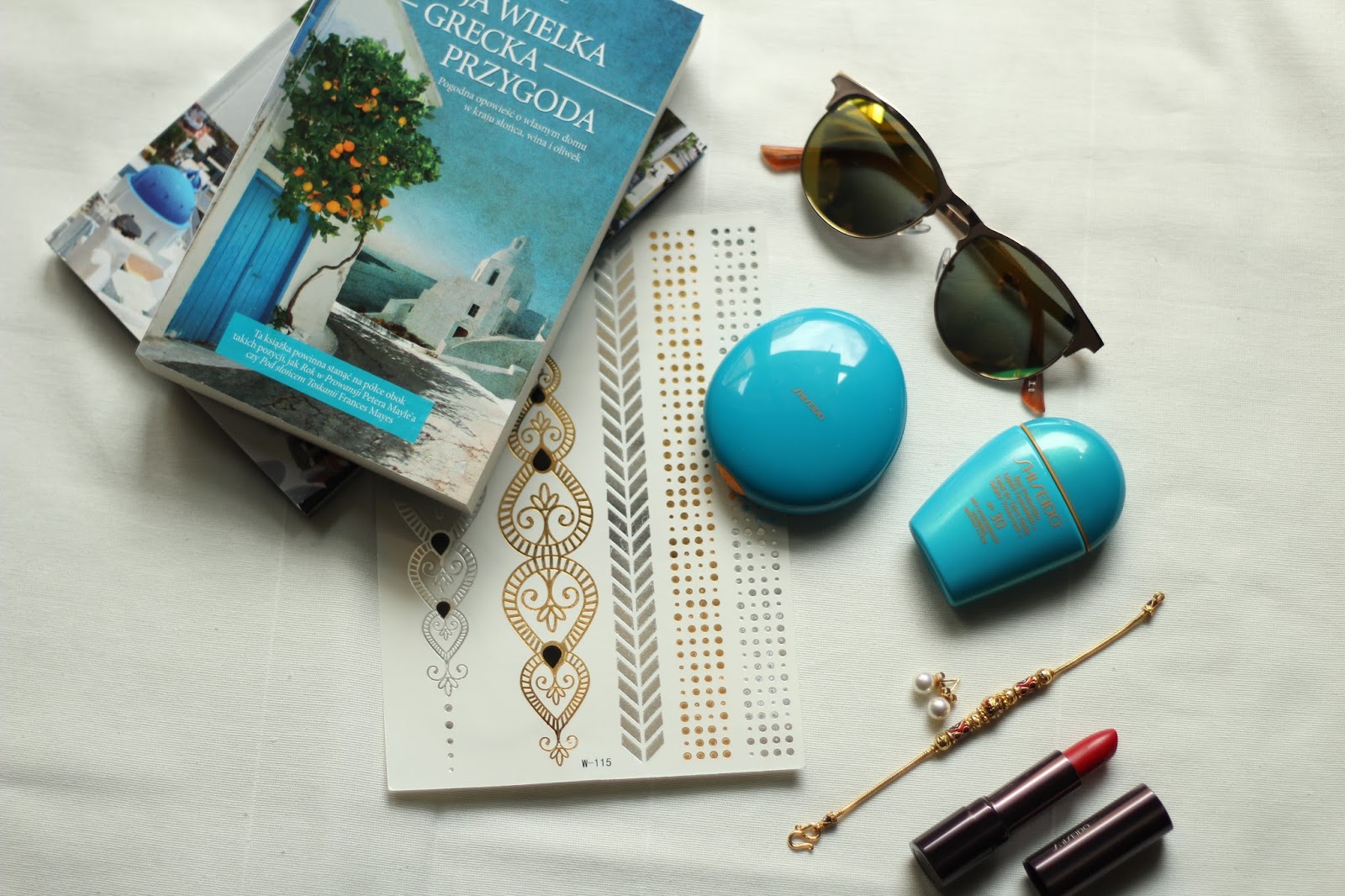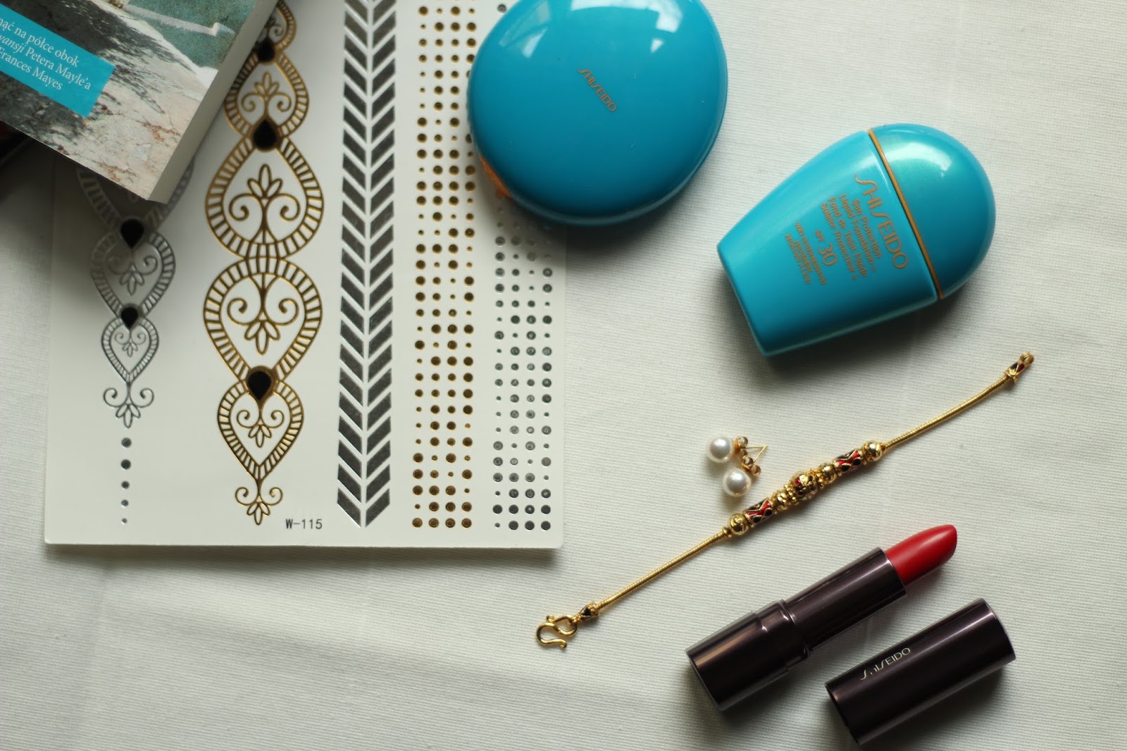 Filtry UV. Bez nich się nie obejdzie! Podkład Shiseido z filtrem SPF 30 będzie idealny, ale pewnie na maksymalnie dwa dni, potem już moja opalona twarz nie będzie potrzebowała podkładu, tylko mocnego kremu z większym filtrem 🙂 Nie zapominajmy o balsamie łagodzącym spieczenia po opalaniu i okularach przeciwsłonecznych. Na zdjęciach możecie również zobaczyć tatuaże-biżuterię. Cóż, dałam się uwieść modzie… na razie nie mogę ich wypróbować, ze względu na spektakle, ale jak już będziemy na miejscu, na pewno się nimi 'obkleję’. Moimi ulubionymi dodatkami są delikatne bransoletki i kolczyki, nic ciężkiego, w taki upał raczej by mnie to drażniło, a nie pomagało poczuć się wyjątkowo 🙂 w mojej kosmetyczce znajdują się podstawowe kosmetyki do makijażu, takie jak maskara, szminka i róże do policzków.
