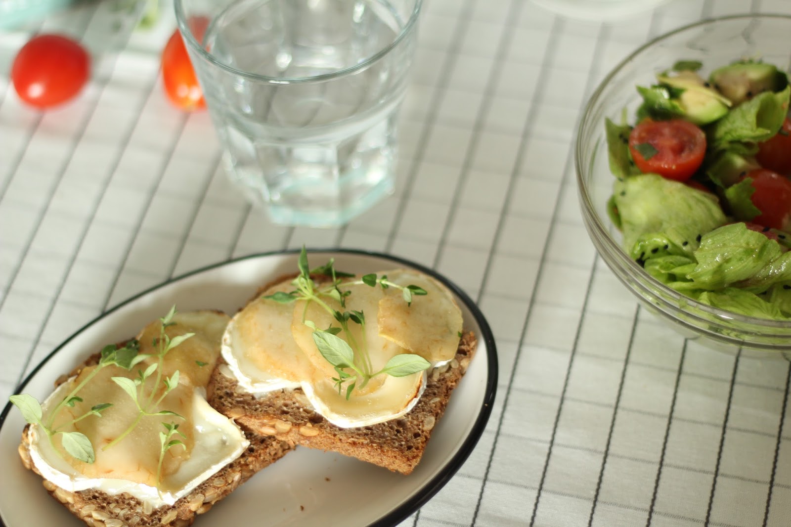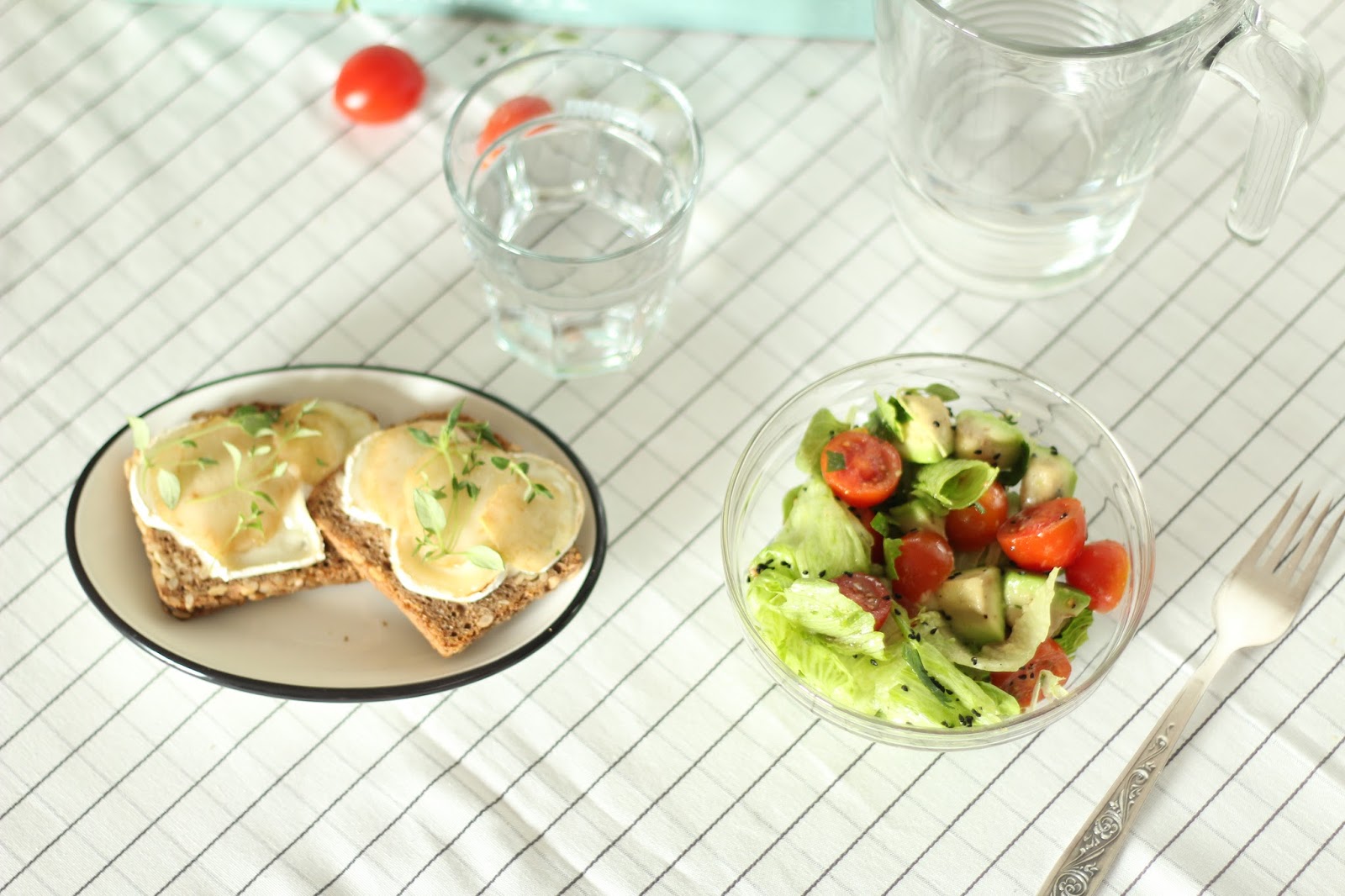 To my fresh salad I added whole-wheat toasts with goat cheese and pear with thyme. You can poured them with honey optionaly. I don’t really like pears but in this case it was just delicious! Just put toasts in the oven in 180 C degrees for 10-15 minutes. Enjoy!