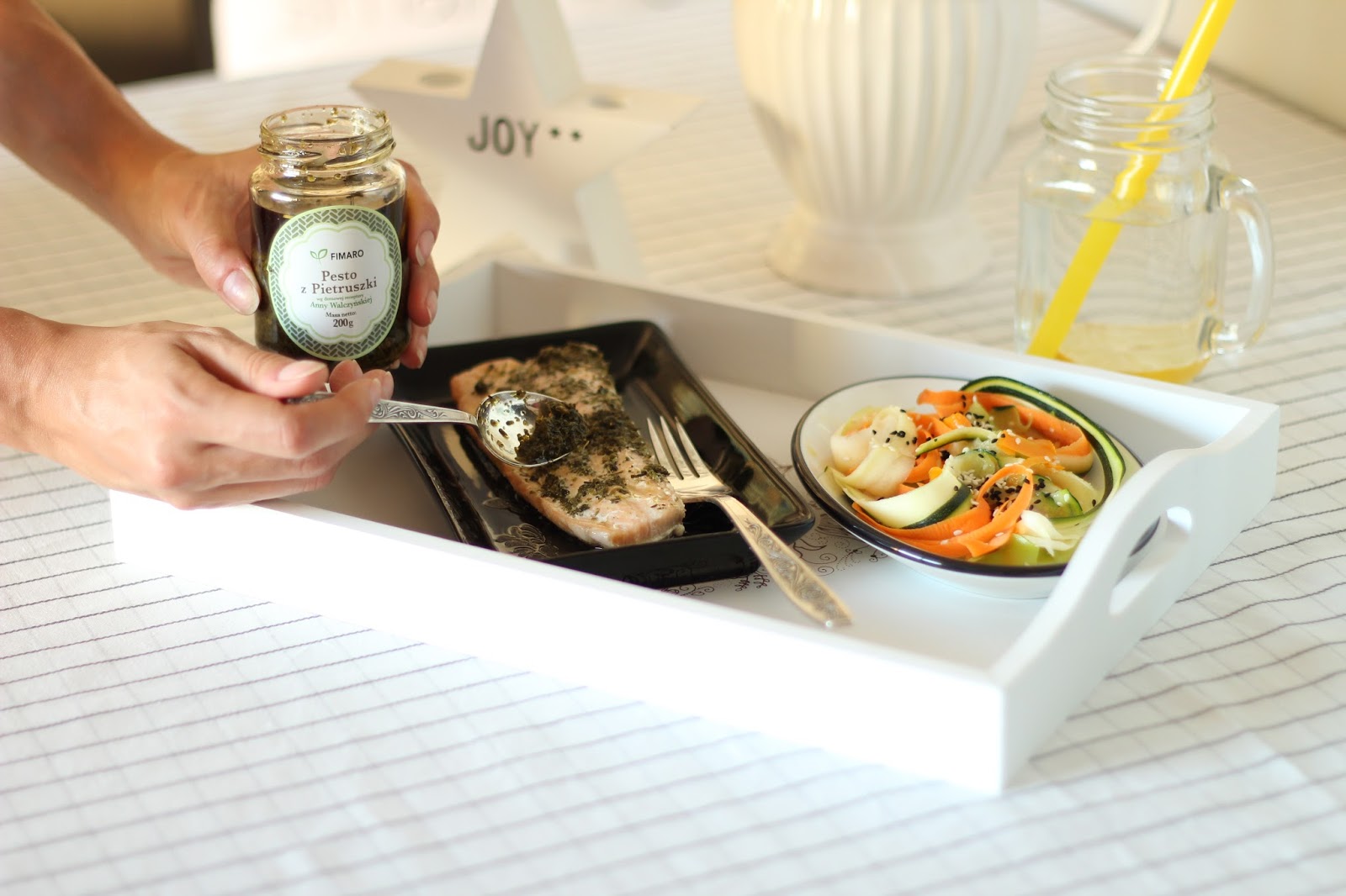 Ponieważ bardzo lubię klasyczne pesto, kiedy tylko w ofercie Fimaro pojawiło się pesto z pietruszki od razu wiedziałam, że muszę je wykorzystać w mojej kuchni! Byłam bardzo ciekawa, jak smakuje takie połączenie. Niedługo zajęło mi znalezienie odpowiedniego kandydata na wypróbowanie go z niekonwencjonalnym pesto. Wiedziałam, że pieczony łosoś idealnie będzie się komponował z subtelnym w smaku przetworem. Nie wiedziałam tylko, jaki dobrać do tego dodatek… aż nieoczekiwanie w Internecie natknęłam się na warzywne spaghetti… idealnie! Wykonanie jest niezwykle proste i przede wszystkim nie zajmuje dużo czasu.