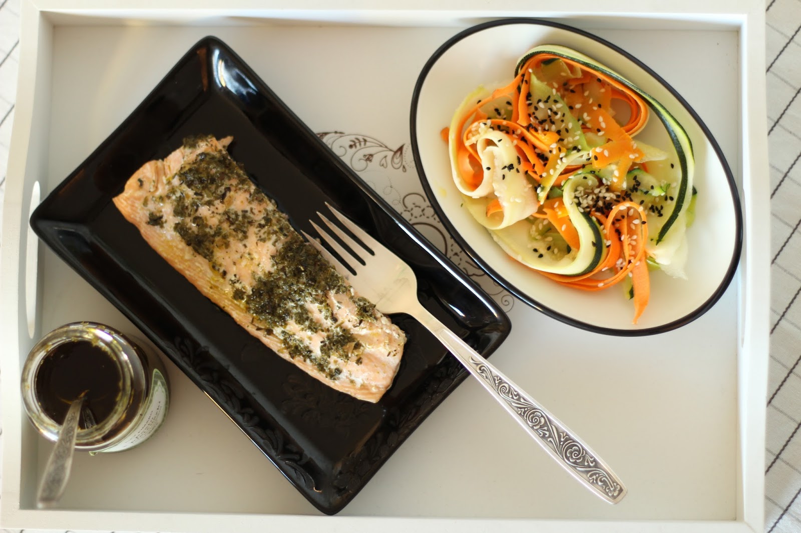 Przed owinięciem filetu z łososia folią, obficie nasmarowałam go pesto, nie dodawałam więcej przypraw. Rybę pieczemy około 30 minut w temperaturze 240 st. Celsjusza. Skrobaczką do warzyw przygotowałam paseczki z cukinii oraz marchewki. Delikatnie należy zblanszować je w osolonej wodzie. Początkowo wrzuciłam je także na patelnię, ale teraz już wiem, że to był błąd… za bardzo zmiękły w dużej temperaturze smażenia. Kolejną porcję jedynie delikatnie zblanszowałam i posypałam prażonym sezamem oraz czarnuszką. Człowiek uczy się całe życie 😉 Jako dodatek możemy również wykorzystać quinoę, przyprawioną po ugotowaniu curry oraz kurkumą. Smacznego!