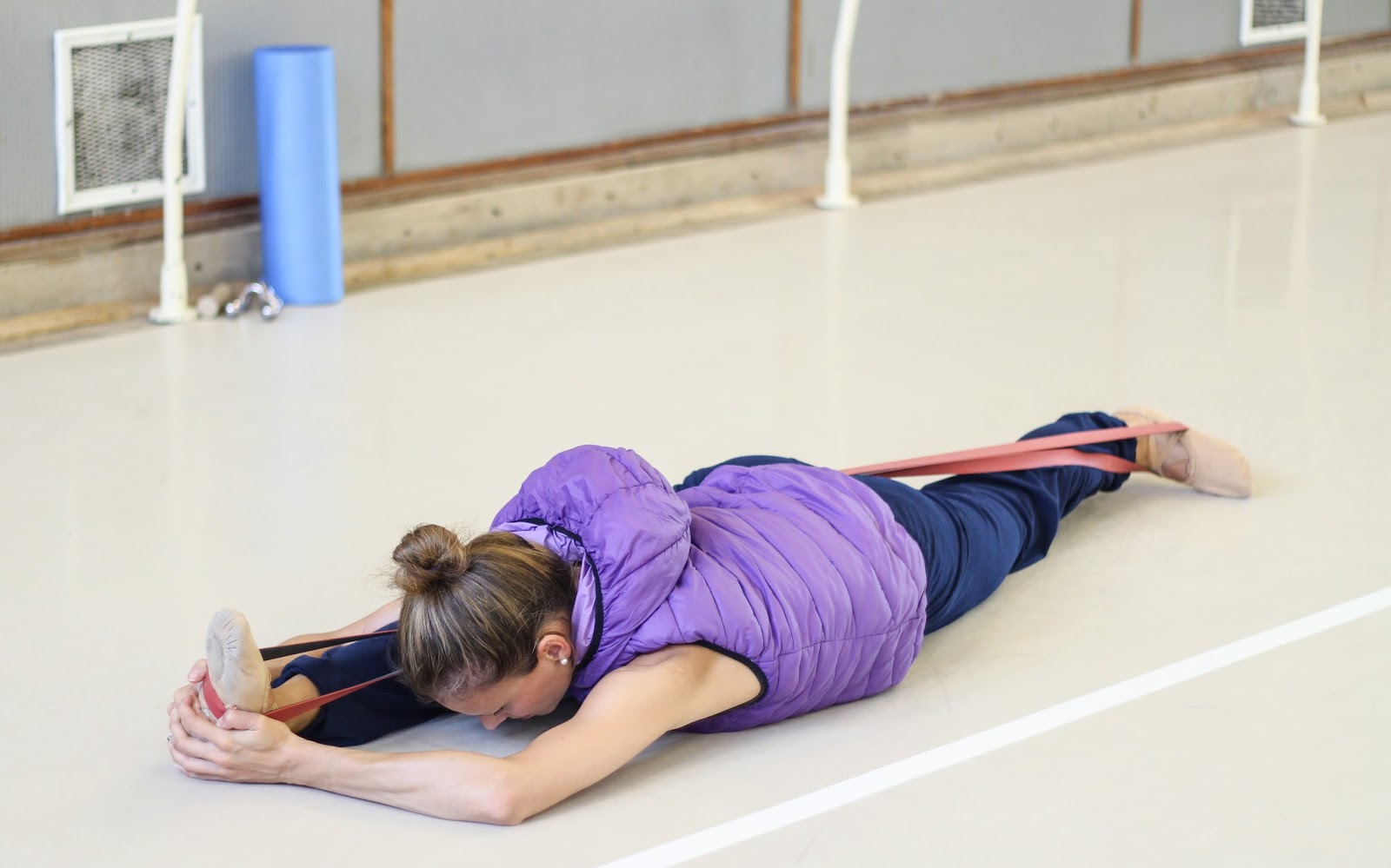 I start with the stretching band. I use it mostly for my splits but also for stretching my arms.