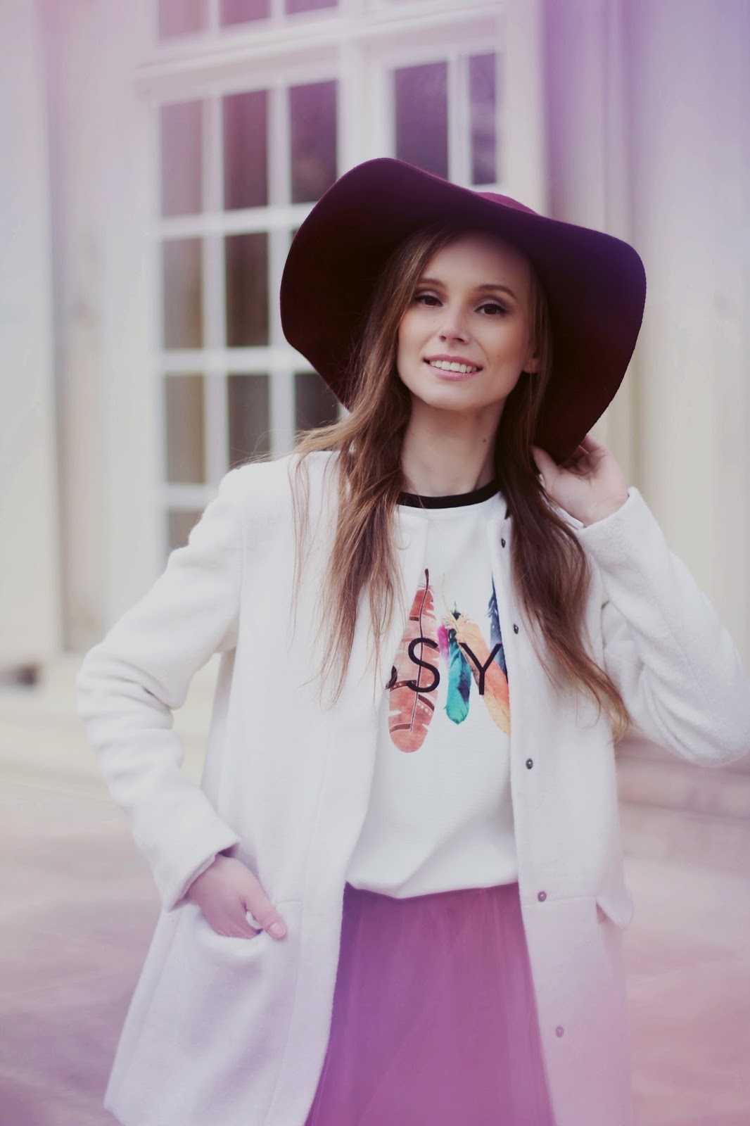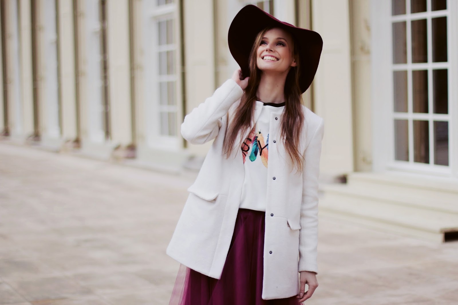 Dzisiaj mam dla Was kolejny dowód… Ubrania marki MetkaBaletka idealnie sprawdzają się na sali oraz w street’owych stylizacjach. Bordową, tiulową spódnicę widzieliście już w sesji wykonanej na sali (tutaj), dzisiaj możecie oglądać ją w codziennym wydaniu w połączeniu z kremowym płaszczem i także bordowym kapeluszem.