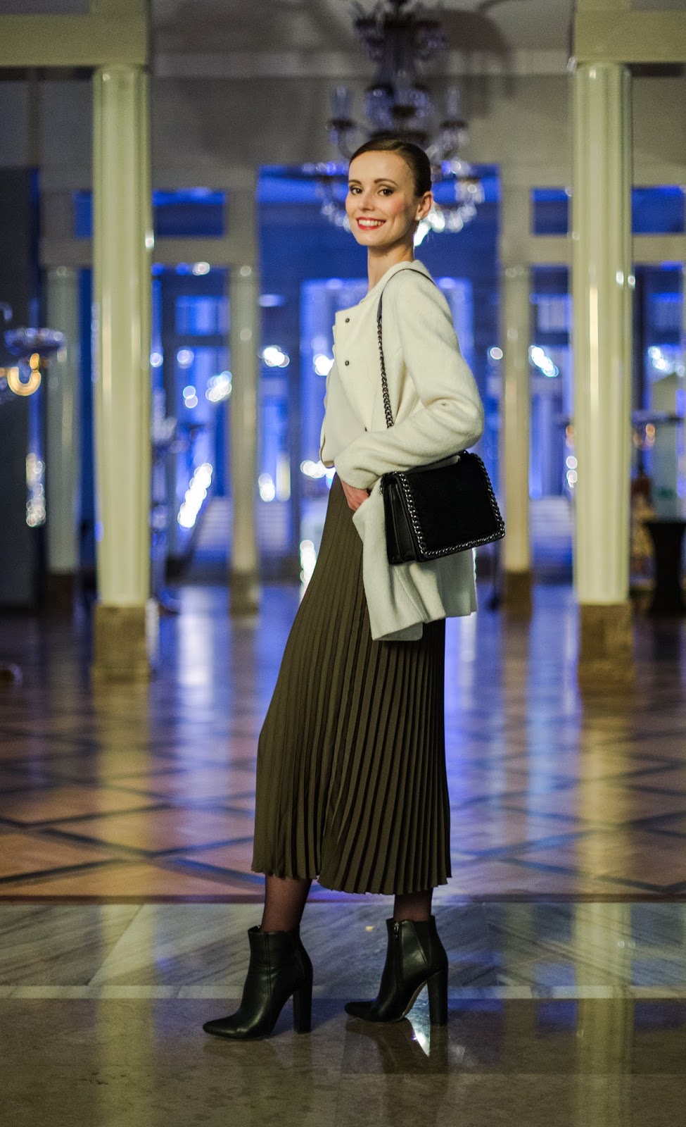 Zdaję sobie sprawę, że zasady te są trudne do realizacji w codziennym pędzie naszego życia, ale sprawienie sobie przyjemności wynikającej z eleganckiego ubrania się może doskonale wpłynąć na nasz nastrój i spowodować, że doznania estetyczne płynące ze sceny zmieszają się z komplementami, które usłyszymy od mężczyzn przy naszym boku 🙂 czy to nie zachęcające?? Dziś prezentuję Wam moją wersję nieformalnego stroju wizytowego, w jakiej sama z chęcią wybrałabym się do teatru. Wracam tym samym do mojego wcześniejszego stwierdzenia: musi być gustownie i z klasą. A ponieważ wyznaję zasadę, że klasyka nigdy nie wychodzi z mody, zdecydowałam się na spódnicę z plisem. Plisowane spódnice od dzieciństwa kojarzą mi się z galowym strojem szkolnym, wystąpieniami w świetlicy z okazji zakończenia roku. Podsumowując- dla mnie to element stroju wizytowego. Wybrałam tę o długości midi w kolorze oliwkowej zieleni, która doskonale współgra z kremowym odcieniem koszuli. Ponieważ jej długość jest dość kłopotliwa najlepszym rozwiązaniem są buty na wysokim obcasie. Ta torebka to mój ulubiony ostatnio dodatek- ozdobiona delikatnym łańcuszkiem z motywem skórki węża listonoszka to prezent, który otrzymałam od męża pod choinkę 😉