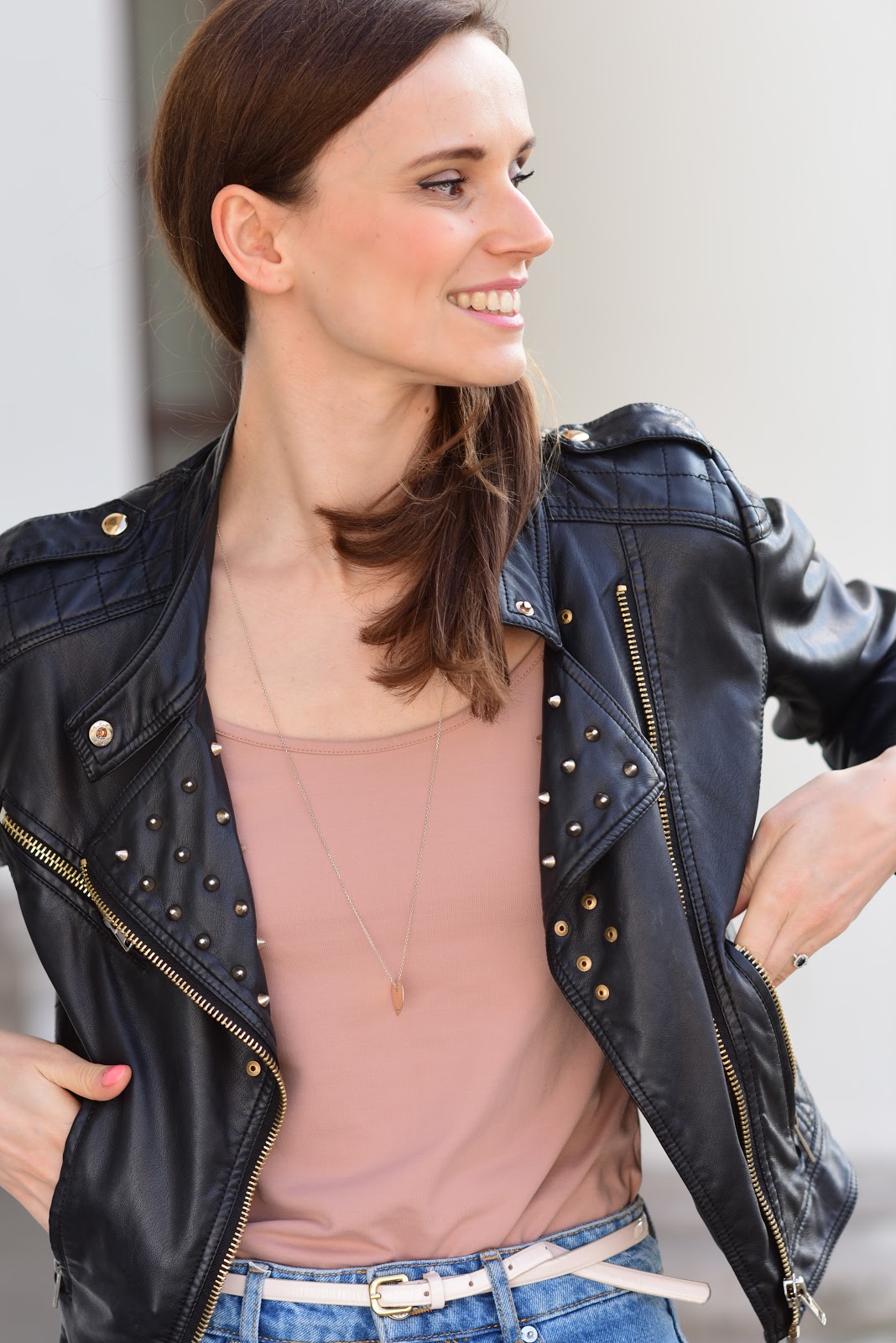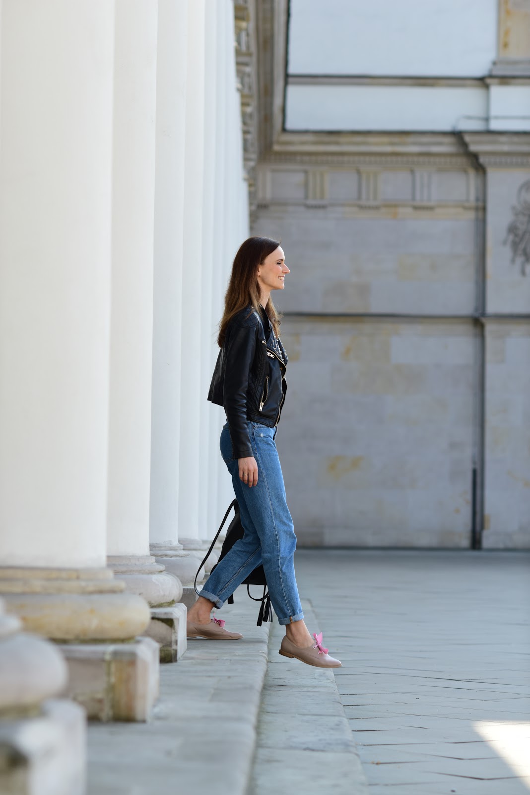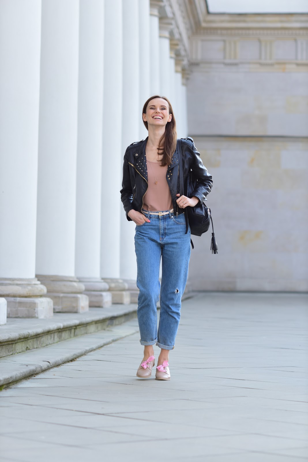 Klasyka gatunku czyli jeansy w kultowym ostatnio kroju mom fit. Spodnie były bazą wyjściową do tej wiosennej stylizacji, dodałam do nich przylegający top w kolorze pudrowego różu i delikatny pasek o podobnym odcieniu. Kolorystycznie dopasowały się do tych barw tasiemki delikatnych butów marki Loft37. Ponieważ nie lubię zbyt wielu kolorów w obrębie jednej stylizacji okryciem wierzchnim została tradycyjna ramoneska z pozłacanymi zdobieniami w kolorze nieśmiertelnej czerni oraz czarny plecak. Szerokie wykończenie ramion ramoneski dobrze koresponduje z szerokim krojem mom jeans w biodrach.