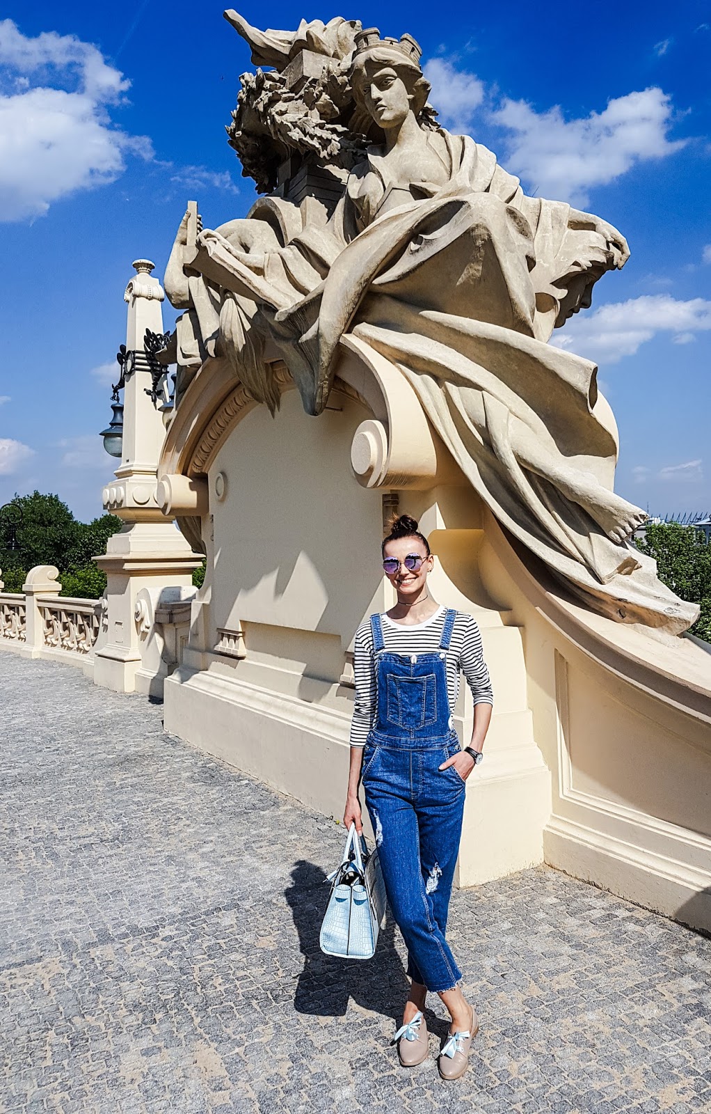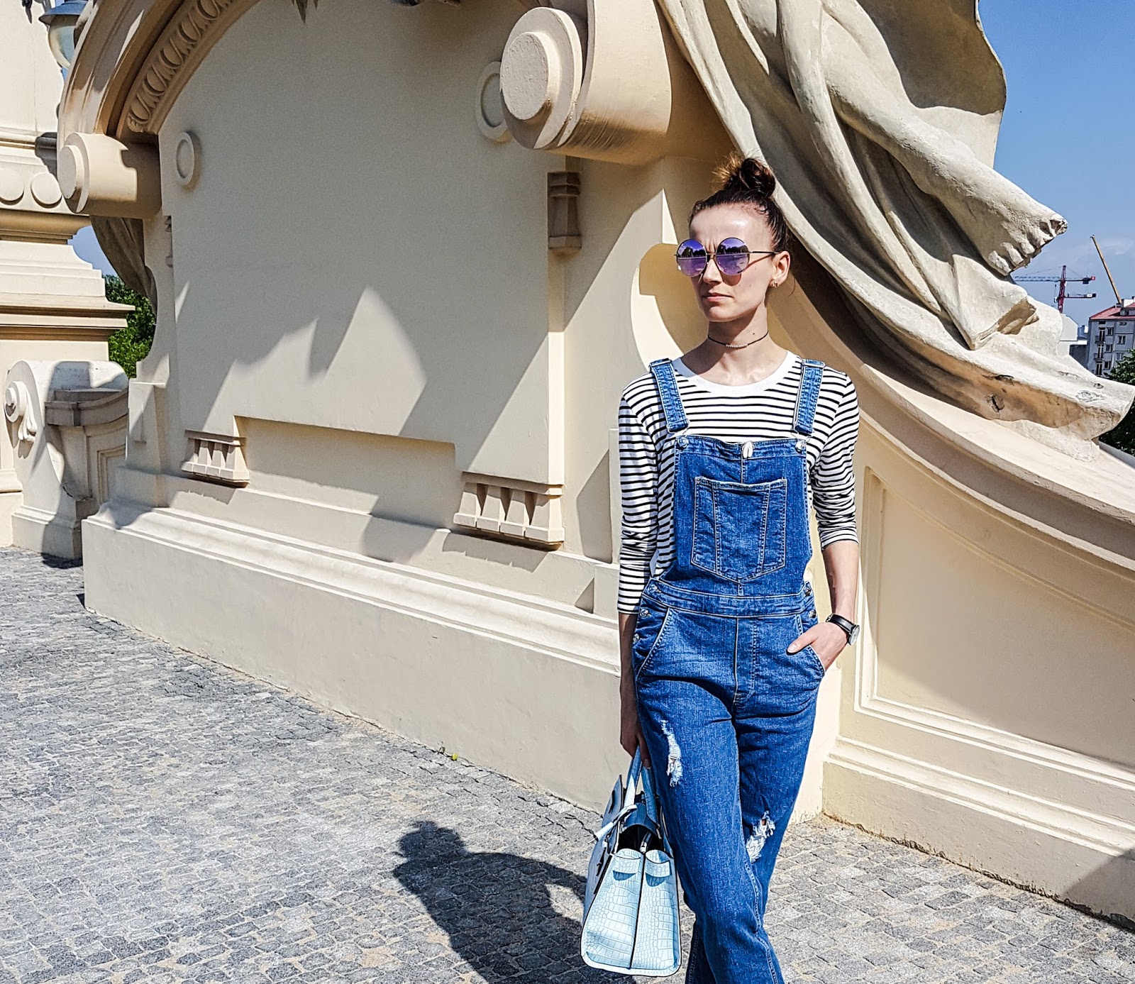 Ostatnio wraz z Karoliną, autorką bloga charlizemystery.com, byłam na pokazie nowej kolekcji Roberta Kupisza, Dessert. Podczas drugiej części pokazu projektant zaprosił widzów w sentymentalną podróż do lat 90tych gdzie królował jeans w każdej postaci. Dzwony, bojówki, katany, koszule w różnorodnych odcieniach błękitu i niebieskiego. Wstrzeliłam się z kupnem jeansowych ogrodniczek idealnie- total jeans look będzie królował w przyszłym sezonie! To nie była łatwa decyzja. Pamiętam, że jako dziecko bardzo nie lubiłam jedynej pary ogrodniczek z jasnego jeansu, które mama przywiozła mi ze Stanów 😀 ojej, jak ja nie chciałam w nich chodzić! Mówią, że raz na parę lat gust człowieka się modyfikuje, więc przyszła pora na zaakceptowanie w moim przypadku tej części garderoby. Do ogrodniczek dodałam kultową bluzkę w marynarskie paseczki i podkreśliłam look dodatkami w odcieniu baby blue. Moje butki z loftu zyskały zupełnie nowy image ze zmienionymi tasiemkami. Zakup tych delikatnych skórzanych butów to był strzał w dziesiątkę! Torebka to model Katy marki Guess, a wygrałam ją w konkursie organizowanym przez answear.com!